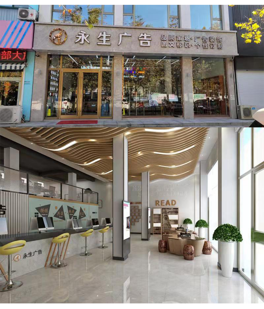 公司自有數(shù)碼沖床設(shè)備、500W光纖機、高精度大幅面噴繪機、寫真機、UV機、多種大小型雕刻機、吸塑機、全自動圍字機、自動開槽機、激光焊接機、拋光機等生產(chǎn)加工設(shè)備,擁有完善的設(shè)計團隊、技術(shù)團隊、施工團隊、售后團隊,可為廣大客戶提供室內(nèi)裝修、店招門頭、精神堡壘、黨建標識、標識標牌、宣傳欄、LED顯示屏、警示標識、精品字、證卡胸牌、證書獎杯、燈箱、桌牌、定制禮品、展具、噴印等多種專業(yè)廣告服務(wù)...